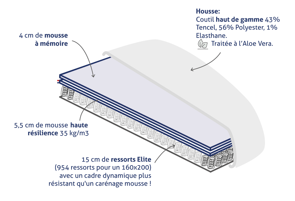 palaces. C’est la combinaison parfaite des meilleurs matériaux sous la même housse pour une sensation de bien-être et d'apesanteur. Nous utilisons les ressorts Elite qui sont composés d’un fil très ferme sur le cadre offrant un matelas respirant sans affaissement.